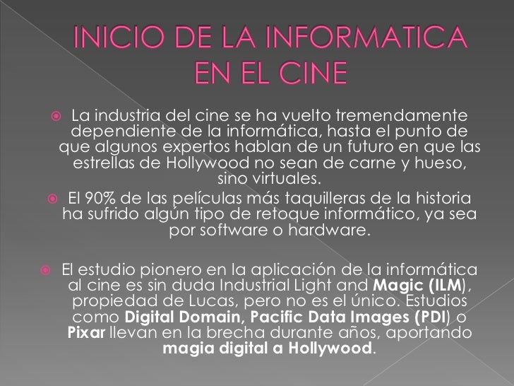 - 2. La industria del cine se ha vuelto tremendamente dependiente de la informática, hasta el punto de que algunos expertos hablan de un futuro en que las estrellas de Hollywood no sean de carne y hueso, sino virtuales. El 90% de las películas más taquilleras de la historia ha sufrido algún tipo de retoque informático, ya sea por software o hardware. El estudio pionero en la aplicación de la informática al cine es sin duda Industrial Light and Magic (ILM), propiedad de Lucas, pero no es el único. Estudios como Digital Domain, Pacific Data Images (PDI) o Pixar llevan en la brecha durante años, aportando magia digital a Hollywood.