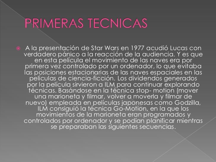 - 3. A la presentación de Star Wars en 1977 acudió Lucas con verdadero pánico a la reacción de la audiencia. Y es que en esta película el movimiento de las naves era por primera vez controlado por un ordenador, lo que evitaba las posiciones estacionarias de las naves espaciales en las películas de ciencia-ficción. Los dividendos generados por la película sirvieron a ILM para continuar explorando técnicas. Basándose en la técnica stop- motion (mover una marioneta y filmar, volver a moverla y filmar de nuevo) empleada en películas japonesas como Godzilla, ILM consiguió la técnica Go-Motion, en la que los movimientos de la marioneta eran programados y controlados por ordenador y se podían planificar mientras se preparaban las siguientes secuencias.