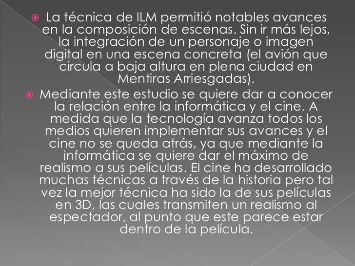 - 4. La técnica de ILM permitió notables avances en la composición de escenas. Sin ir más lejos, la integración de un personaje o imagen digital en una escena concreta (el avión que circula a baja altura en plena ciudad en Mentiras Arriesgadas). Mediante este estudio se quiere dar a conocer la relación entre la informática y el cine. A medida que la tecnología avanza todos los medios quieren implementar sus avances y el cine no se queda atrás, ya que mediante la informática se quiere dar el máximo de realismo a sus películas. El cine ha desarrollado muchas técnicas a través de la historia pero tal vez la mejor técnica ha sido la de sus películas en 3D, las cuales transmiten un realismo al espectador, al punto que este parece estar dentro de la película.